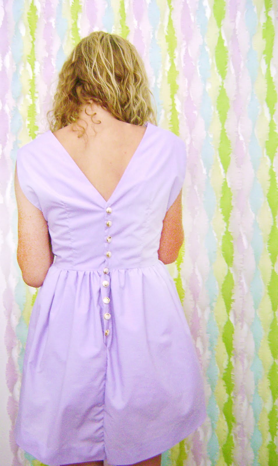 So here it is! The finished product. It's a sweet hourglass silhouette with two whole yards wrapped around her tiny waist. I'm in love with the armhole shape (they were her idea). And the deep v-neck back is my favorite part. It's accented with gold and white pearlescent buttons that matched so perfectly with her nude heels that we based the whole colorstory after. Speaking of which, the lavender works so well on her. I'm just enamored with this dress.